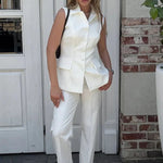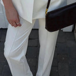 • Skabelse og silhuet: Vestens struktur fremhæver taljen, bukserne forlænger silhuetten.