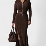 Det lange, figursyede snit og det justerbare taljebælte fremhæver kroppens form og skaber en elegant silhuet, der bevæger sig let og yndefuldt.