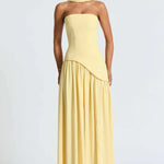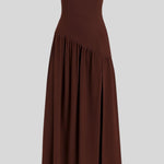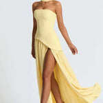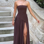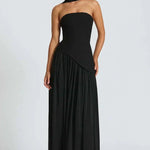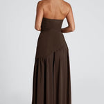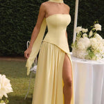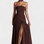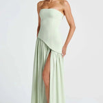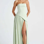 • Bevægelse og silhuet – Off-shoulder-modelens struktur fremhæver silhuetten med en asymmetrisk talje og draperet, fuldt langskørt med høj splits for naturlig bevægelse.
