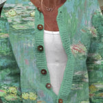 Tanja | Grøn cardigan er mere end en trøje; det er et kunstværk i tøj, der forener naturens skønhed med daglig komfort. Den rolige grønne baggrund og de maleriske detaljer henfører til en beroligende vandhave og giver garderoben en særlig nuance. Det håndværksmæssige design udviser omhu og tidløs elegance, mens den naturlige farvepalet og de vandfarve-lignende mønstre fremkalder en rolig, kunstnerisk stemning. Som et tidsløst komplement til hverdagen varmer Tanja gennem sæsonerne og taler til bevidste samlere af kvalitet, hvor hvert stykke bærer sin egen fortælling.