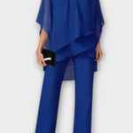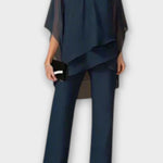 • Silhuet og design: Asymmetrisk top fremhæver skulder og talje, mens lige bukser forlænger silhuetten med diskret elegance.