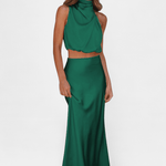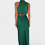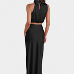 • Tidløs elegance – draperet halterneck-top med åben ryg og skulpturel silhuet, der udstråler moderne sensualitet uden at gå på kompromis med klassisk stil.