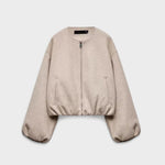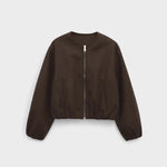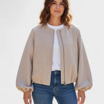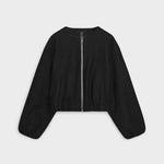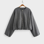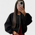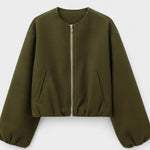 Det cropped snit og de elegante ballonærmer skaber en flatterende silhuet, mens den bløde foring og praktiske lynlås gør den perfekt til både byliv og weekendture.