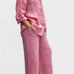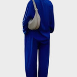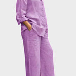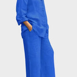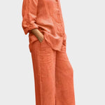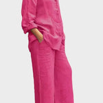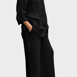 - Silhuet og pasform – Løs top og lige bukseben giver bevægelsesfrihed og en sofistikeret, tidløs silhuet.