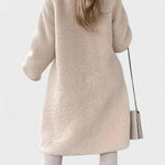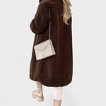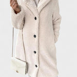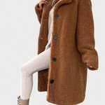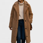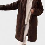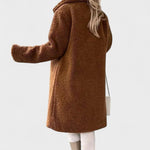 Den silkebløde teddy-kvalitet omslutter kroppen med varme og komfort, mens den elegante krave og det minimalistiske snit giver et raffineret, moderne udtryk.
