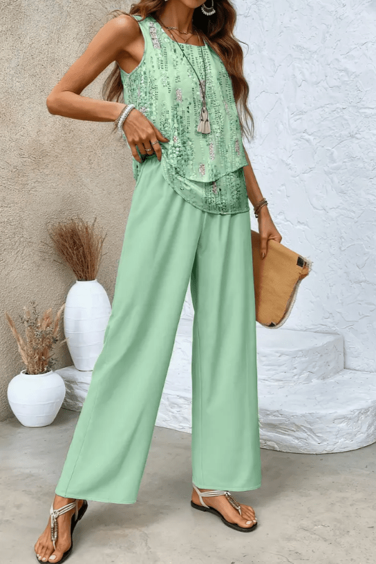 • Bevægelighed og styling: Den lette, luftige konstruktion giver bevægelsesfrihed og gør Lærke | Menthol Sæt alsidigt til brunch, havefester og elegante aftener.