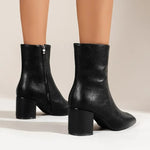 Disse stilrene ankelstøvler med blokhæl og blank finish tilføjer et moderne og sofistikeret touch til ethvert outfit. Den minimalistiske silhuet kombineret med den robuste hæl giver både komfort og visuel styrke – uanset om du styler dem til jeans, kjole eller buksedragt. Den diskrete lynlås på indersiden gør dem nemme at tage af og på, mens den skinnende overflade tilføjer glamour til både hverdag og aftenlook.