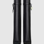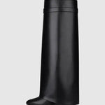 Gør et markant indtryk med disse sorte sculpted pant boots – en banebrydende fusion mellem fodtøj og fashion sculpture. Den arkitektoniske silhuet giver illusionen af et lige bukseben, mens den skjulte støvle indeni tilbyder komfort og funktionalitet. Det skinnende sorte finish kombineret med den elegante sølvlås og nøglering tilføjer en luksuriøs og futuristisk vibe.