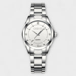 • Materiale og finish: Urkassen i poleret rustfrit stål (34 mm) med en slank 7 mm profil og en minimalistisk, poleret urskive.