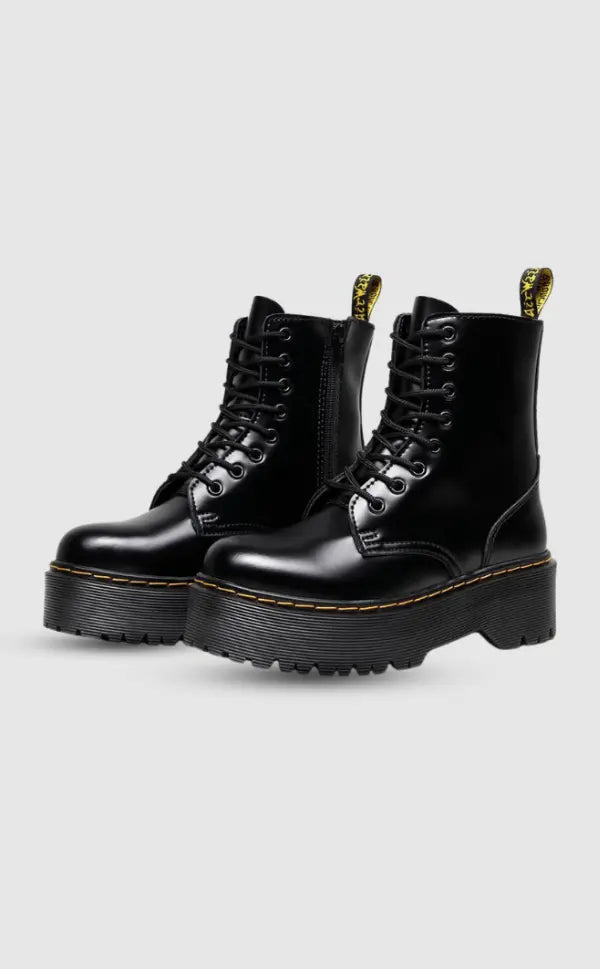 Sæt scenen for dit outfit med disse chunky combat støvler – en moderne fortolkning af den klassiske militærstøvle, nu med høj platform og edgy attitude. De sorte læderlook-støvler kombinerer snørebånd med lynlås i siden for nem adgang og har den ikoniske gule syning langs sålen, som giver dem en rå og iøjnefaldende detalje.