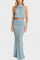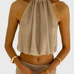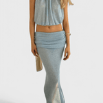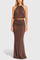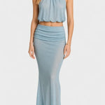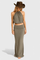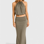 • Silhuet og detaljer: halterneck-top i let gennemsigtigt materiale og en svævende maxikjole med sidesplit, der skaber bevægelse og subtil drama.