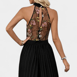• Håndværksmæssig konstruktion: Håndværksmæssigt konstrueret med et struktureret korset, halterneck og delikat blomsterbroderi i gennemskinneligt materiale, der skaber en sofistikeret og holdbar silhuet.